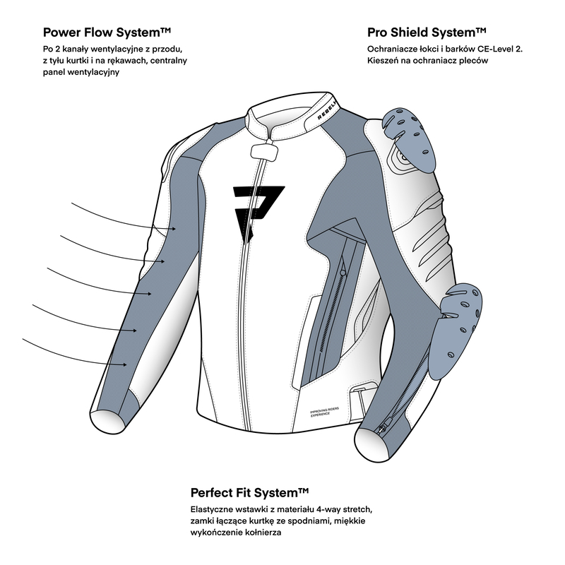 - zamki łączące (360° i krótki), dzięki którym zepniesz kurtkę z dowolnymi spodniami marki Rebelhorn