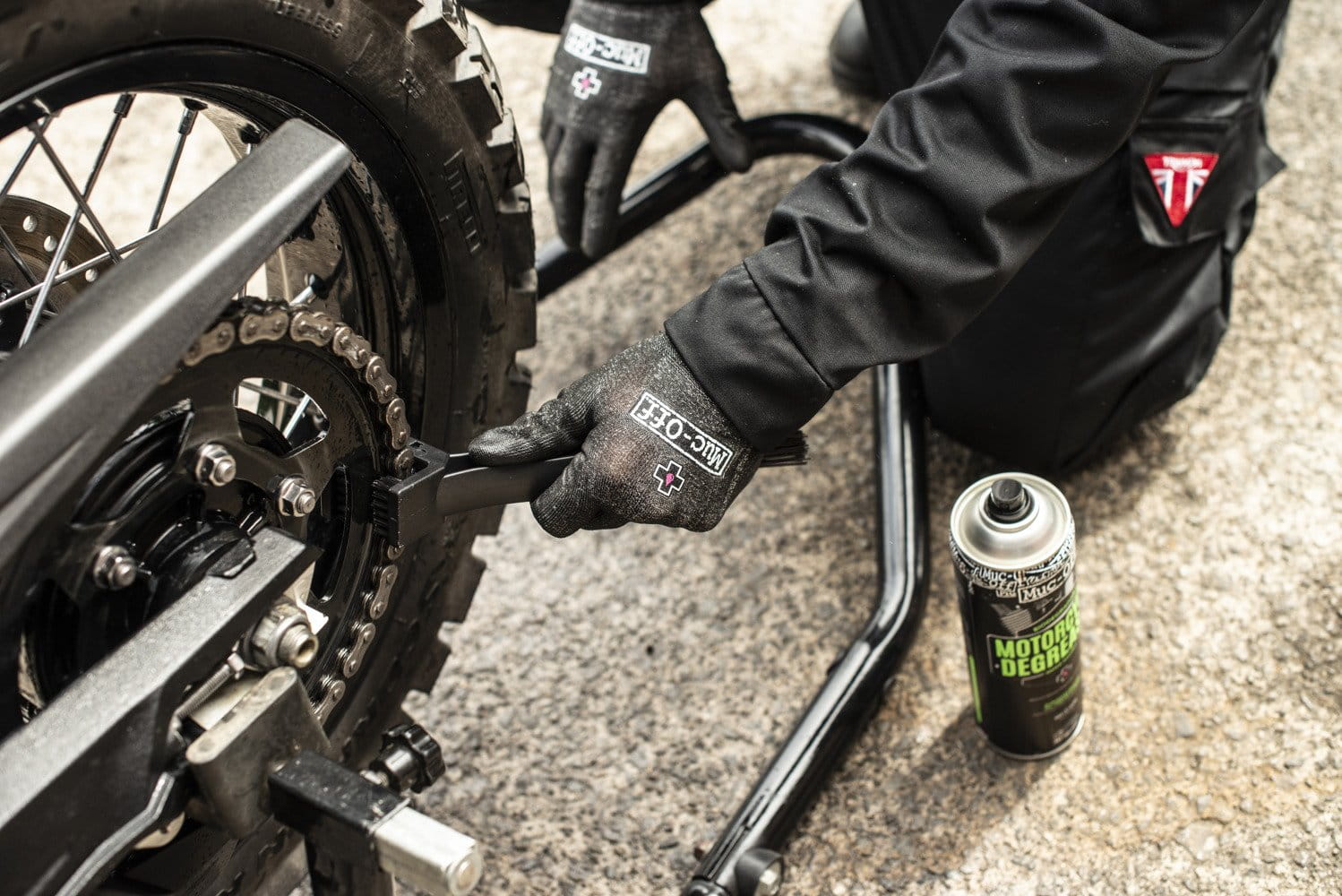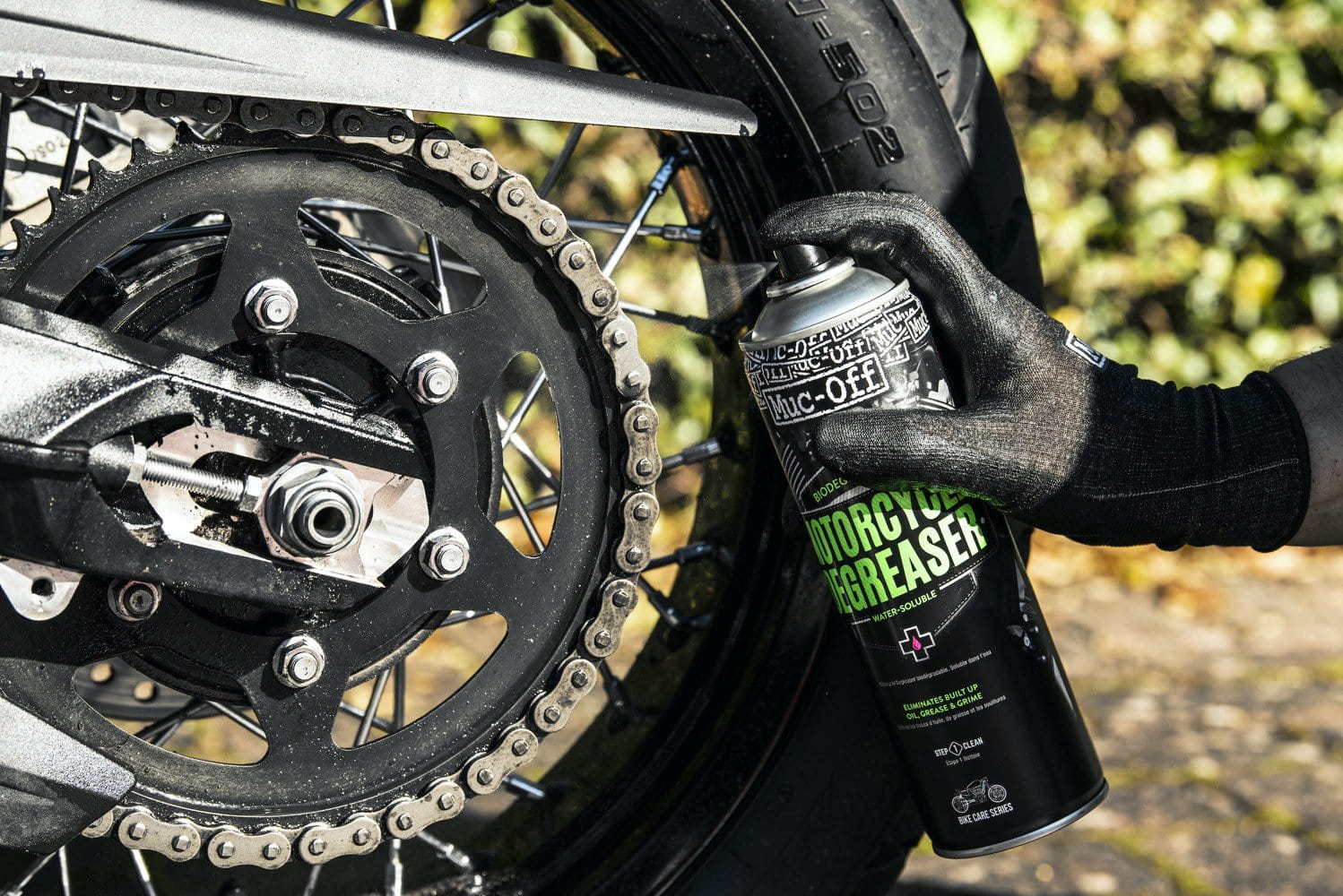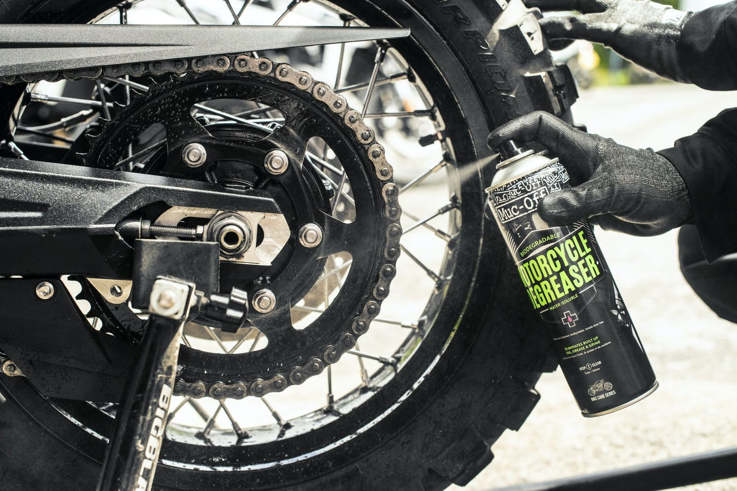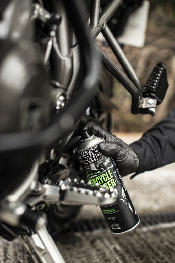 Krok 1 - Przed użyciem wstrząśnij puszkę, dzięki czemu formuła sprayu zostanie aktywowana. Nałóż spray na ubrudzone smarem elementy motocykla.