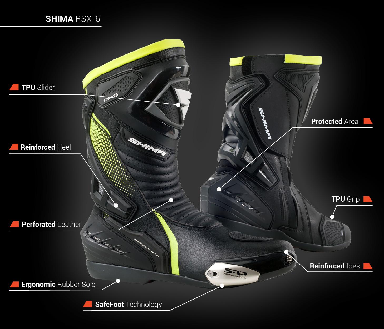 Buty RSX-6 to sportowy but o ergonomicznie pochylonej konstrukcji dopasowanej do pozycji motocyklisty. Na boku znajduje się slider TPR. Poprzecznie wzmacniana podeszwa w systemie SafeFoot. Specjalna syntetyczna nakładka umieszczona z przodu buta pozwala precyzyjniej obsługiwać dźwignię zmiany biegów.