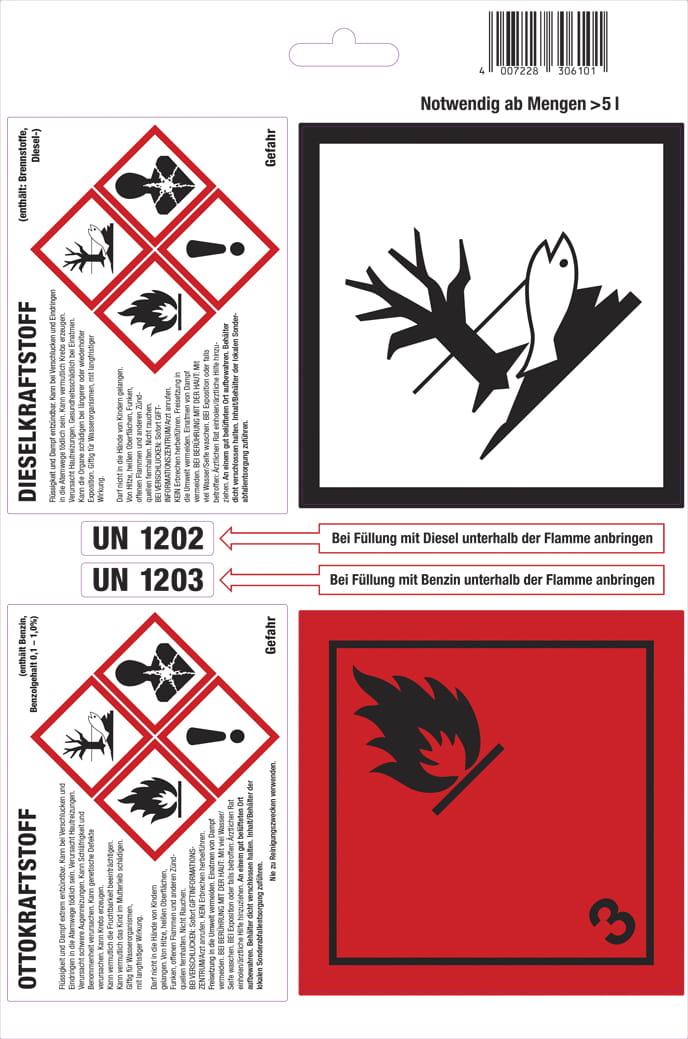 Etykiety do zaczepiania na kanistrach benzyny lub oleju napędowego 25 arkuszy po 4 szt., białe błyszczące, perforacja Euro