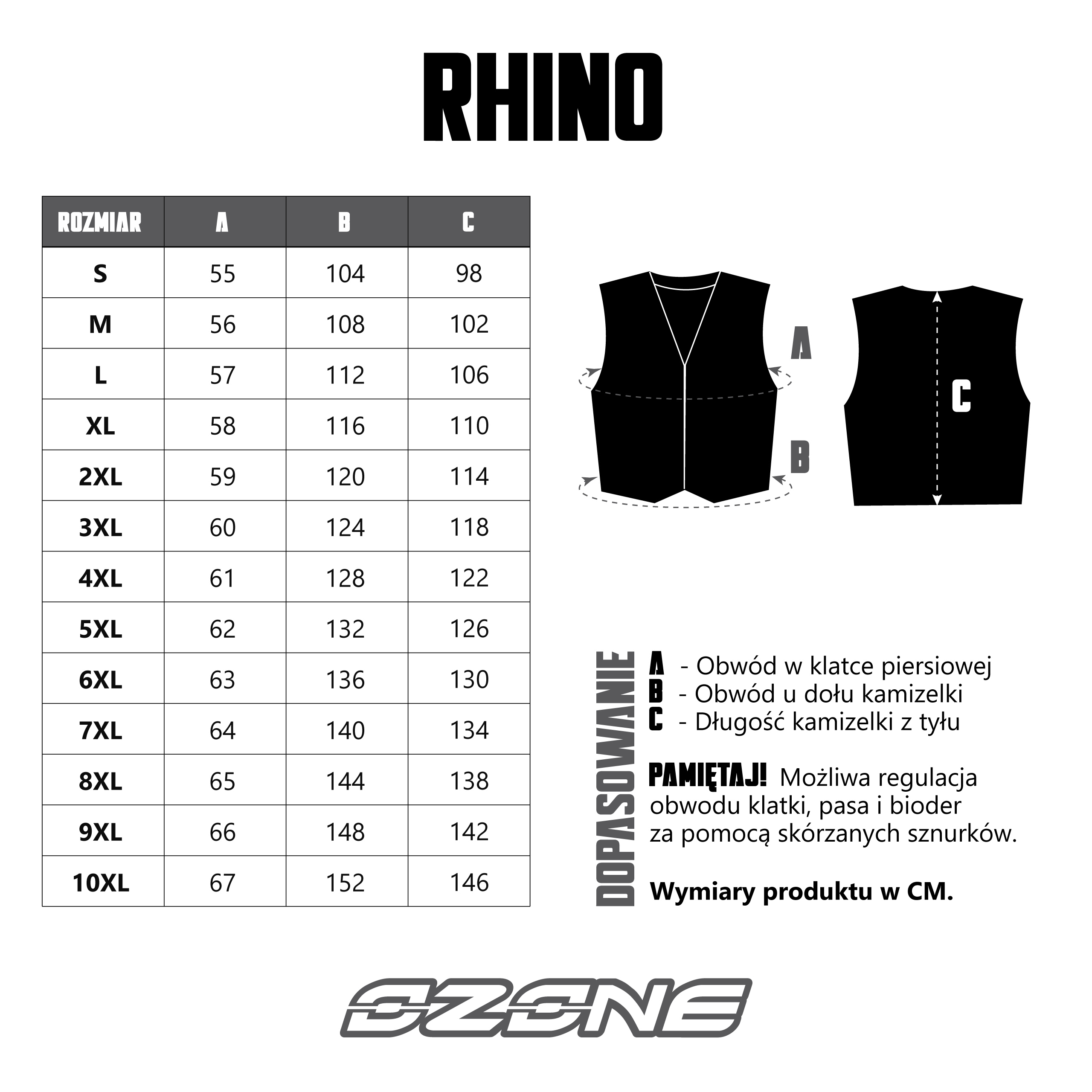 Kamizelka motocyklowa skórzana Ozone Rino wykonana została ze skóry bawolej. Dzięki podwójnym szwom, kamizelka cechuje się zwiększoną wytrzymałością i trwałością. Po 2 kieszenie wewnątrz i na zewnątrz, zapewniają przestrzeń na najważniejsze akcesoria. Ozone Rino ma miejsce na naszywki klubowe. MATERIAŁ WYKONANIA