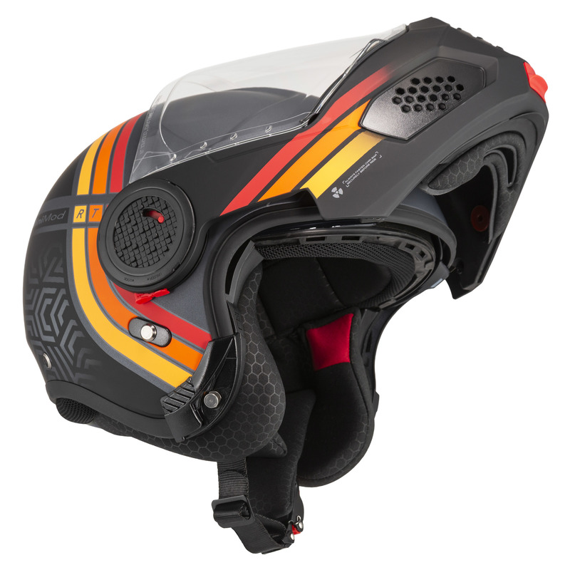 Kask motocyklowy NZI MINIMOD DUO to wyjątkowo kompaktowy kask szczękowy spełniający restrykcyjne normy UN ECE R22.06 oraz posiadający homologację P/J, zapewniając bezpieczeństwo zarówno w konfiguracji zamkniętej, jak i otwartej. Jest wyposażony w wizjer z powłoką ograniczającą parowanie oraz blendę przeciwsłoneczną. Dzięki specjalnym kanałom dla osób noszących okulary oraz wyciszającym deflektorom jazda staje się bardziej komfortowa i przyjemna. To nowoczesny, praktyczny i lekki kask idealny do jazdy miejskiej i turystycznej.
