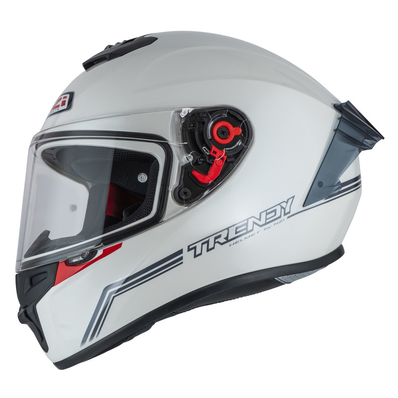 Kask motocyklowy NZI TRENDY STREAM to kask integralny spełniający normę UN ECE R22.06, zaprojektowany z myślą o miejskiej jeździe i krótkich trasach. Sportowa, dynamiczna linia skorupy oraz wbudowany spoiler nadają mu agresywny wygląd i poprawiają stabilność podczas jazdy. Wizjer o wysokiej jakości optycznej zapewnia świetną widoczność, a przygotowanie pod wkładkę Pinlock pozwala łatwo zapobiegać parowaniu. To prosty, lekki i wygodny model, który dzięki nowoczesnej grafice wyróżnia się na tle innych kasków.