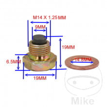 Śruba wyposażona jest w magnes, który przyciąga cząstki metali znajdujące się w oleju. Zastępuje ona śrubę fabrycznie montowaną. Wymiary podano w następujący sposób: rozmiar gwintu metrycznego x skok gwintu w mm.