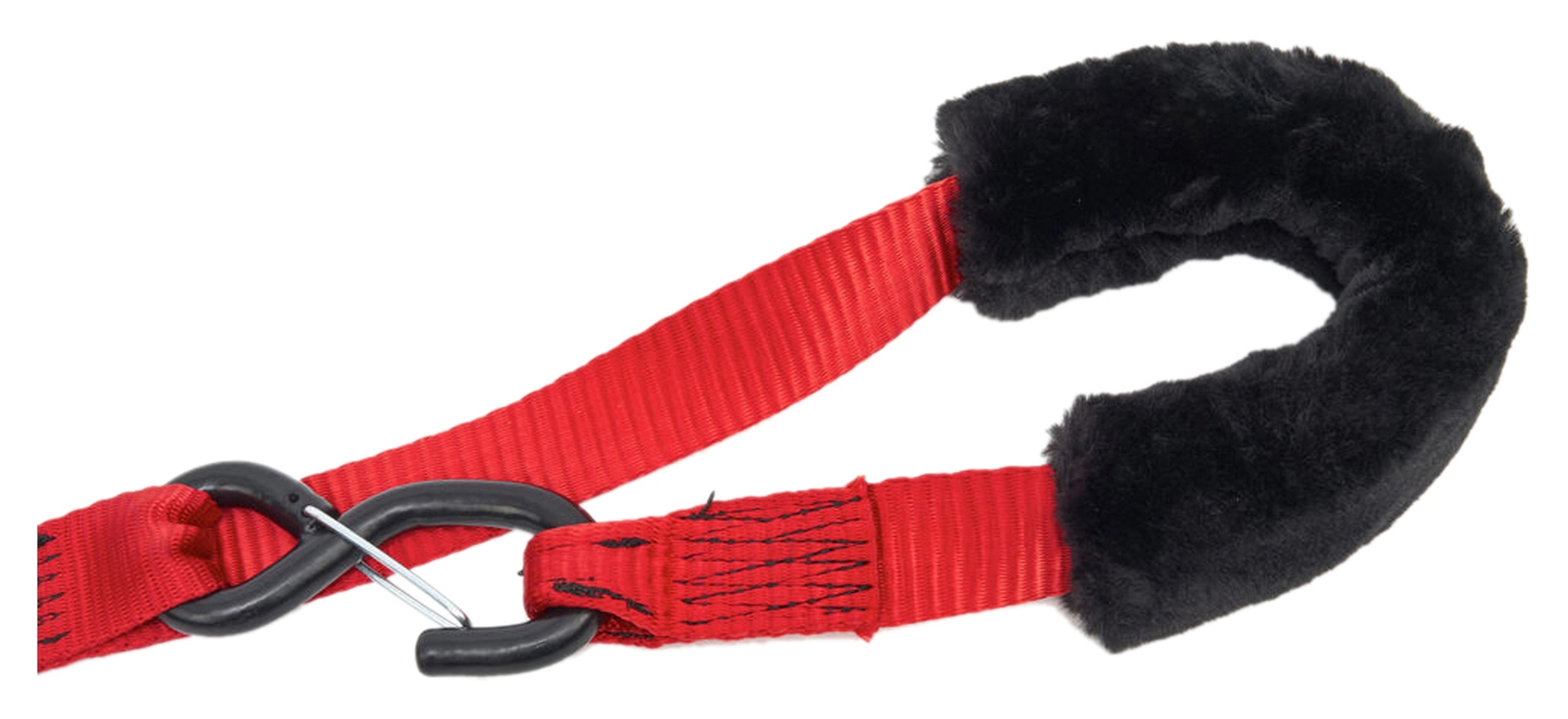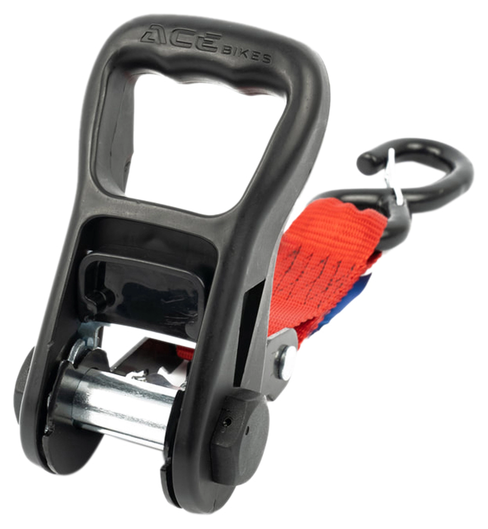 Jest on zasadniczo wykonany z wysokiej jakości poliestru i wyposażony w szczególnie wysokiej jakości wytrzymałą grzechotkę. Długi, czarno-czerwony pas mierzy ok. 200 cm. Jego część pętlowa jest również pokryta kawałkiem sztucznej owczej wełny – w celu ochrony motocykla. Dzięki nośności 900 daN i szerokości 38 mm, Acebikes *Ratchet Premium Deluxe* jest wyjątkowo stabilny. Wystarczy kilka prostych kroków, a pas mocujący zostaje założony oraz zapięty bezpiecznie i mocno za pomocą ocynkowanej grzechotki.