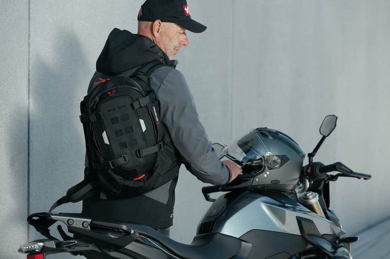 Plecak ma wzmocnioną przednią komorę z systemem MOLLE, do którego możesz zamocować dodatkowe torby akcesoryjne SW-Motech. Dzięki czterem bocznym paskom dostosujesz jego objętość do swoich potrzeb. Plecak ma też osłonę przeciwdeszczową mocowaną na pętle, dzięki czemu nie zwieje jej podczas jazdy, nawet przy dużych prędkościach. System nośny składa się z regulowanych szelek oraz wygodnego pasa biodrowego z szybkim zapięciem.