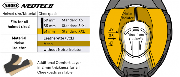 Dzięki naszym poduszkom policzkowym możesz zastąpić oryginalną wyściółkę swojego kasku. Lub użyj nieco grubszej lub cieńszej podkładki do indywidualnej regulacji. Poduszki policzkowe modelu kasku są wymienne we wszystkich dostępnych rozmiarach, co przedstawia tabela poniżej.
