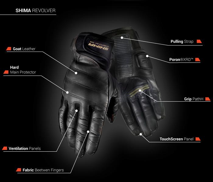 Rękawice REVOLVER to rękawice o klasycznej linii dyskretnie skrywające technologie ochronne. Po wewnętrznej stronie znajduje się panel ochronny PORON®XRD, który doskonale absorbuje impakt uderzenia. Na kostkach umieszczone zostały twarde protektory,a dodatkowe panele ochronne znajdują się na boku dłoni. REVOLVER posiada przewiewne nylonowe wstawki pomiędzy palcami, zapewniające bardzo dobrą wentylację oraz panel dotykowy TOUCH TIP, który umożliwia obsługę telefonu. Zakładanie rękawicy ułatwione jest dzięki specjalnemu uchwytowi.