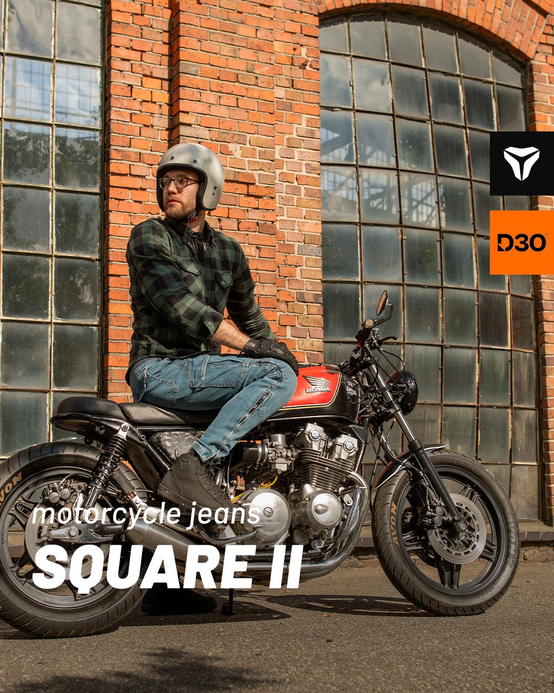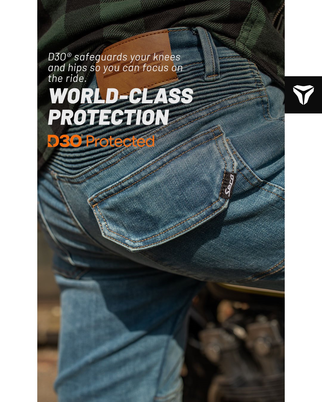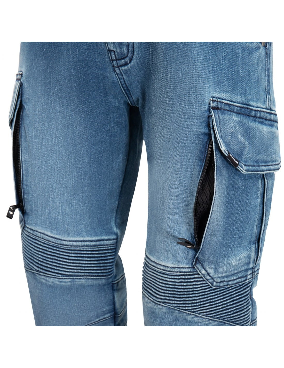- Odporny na przetarcia i elastyczny materiał FlexTech Denim® ze wzmocnieniami DuPont Kevlar®