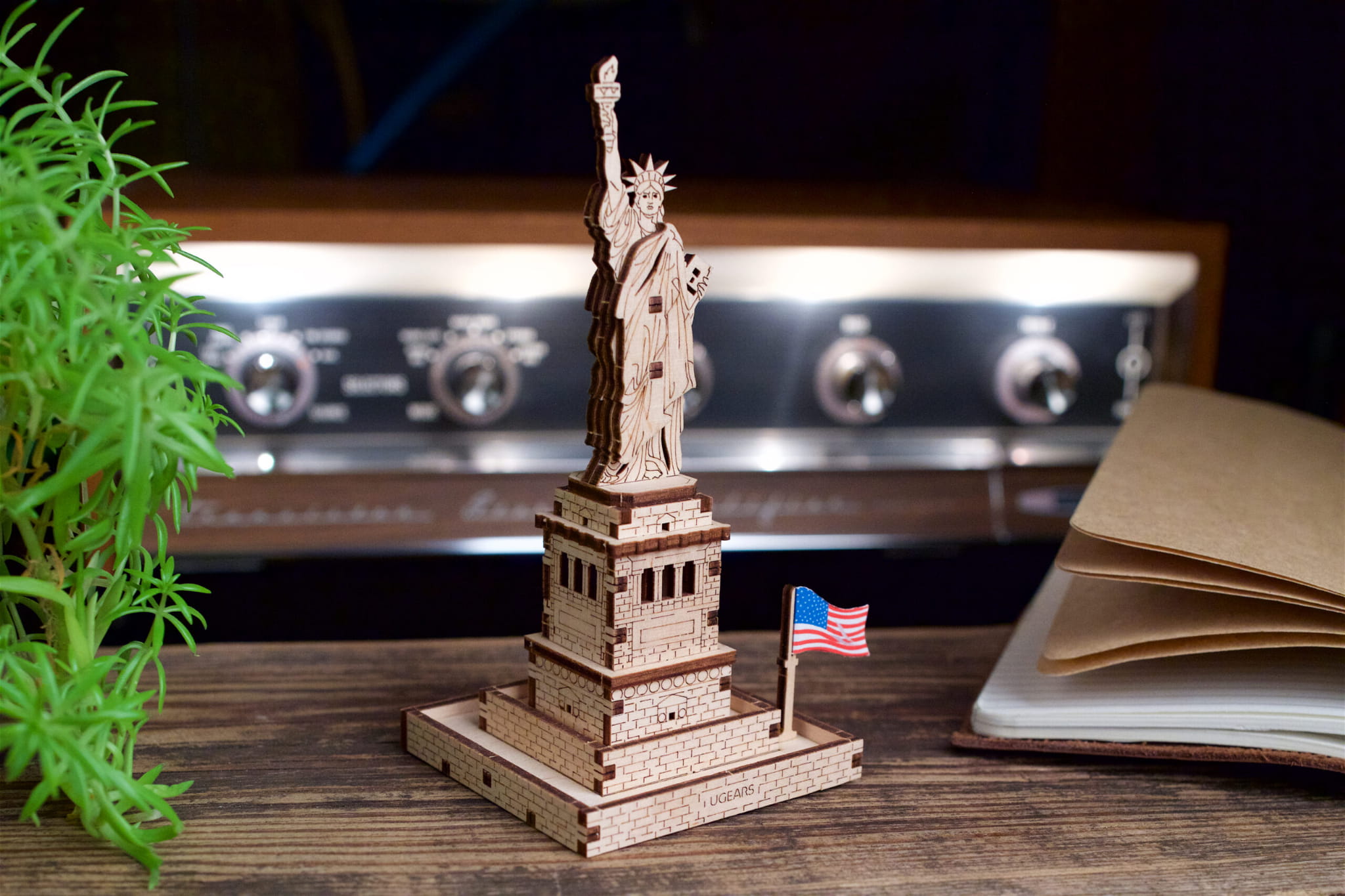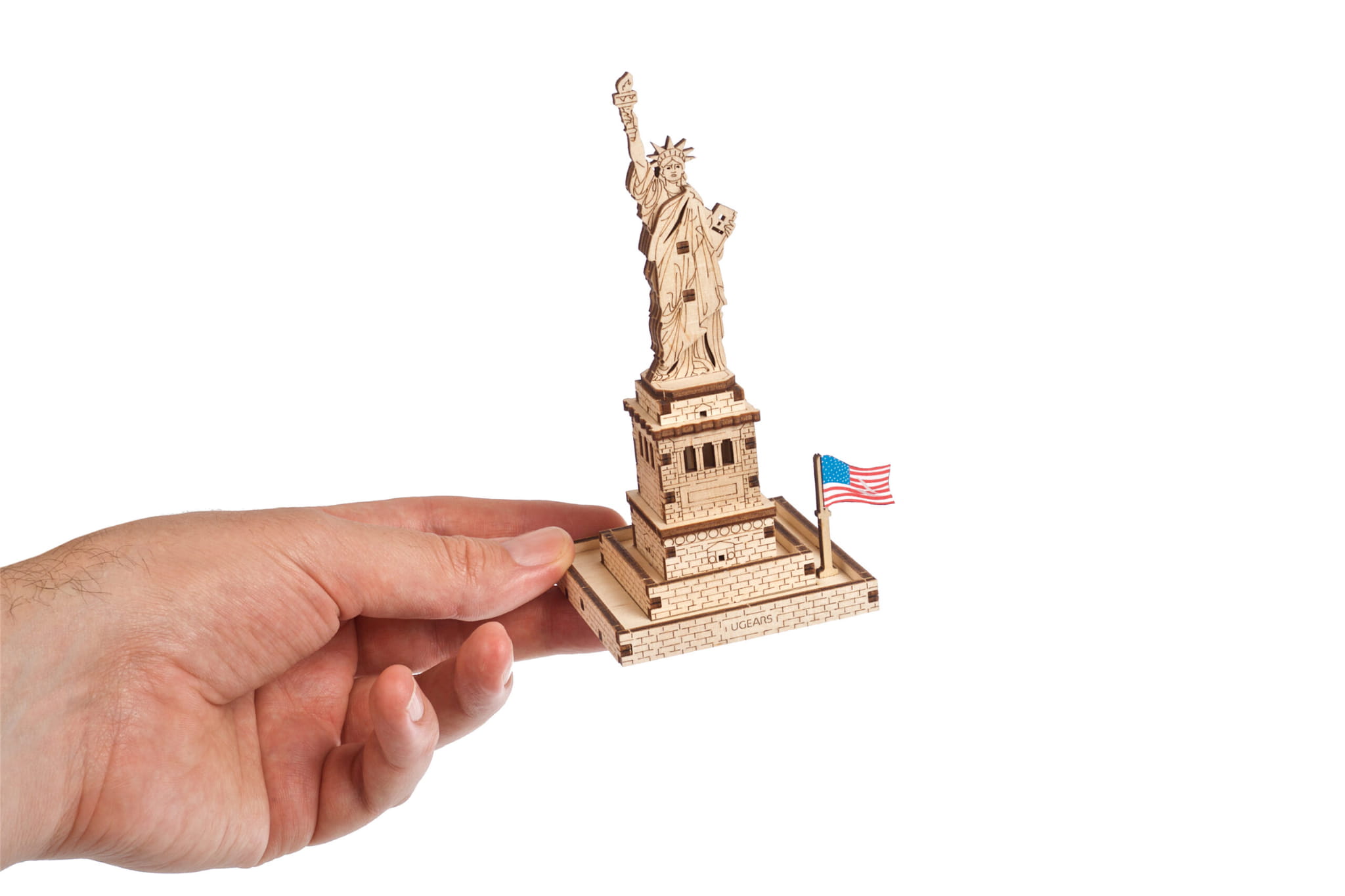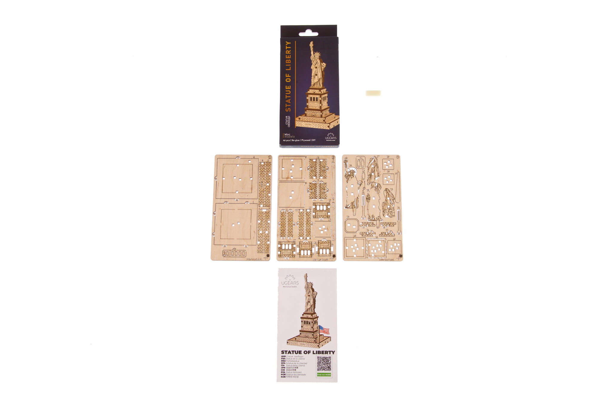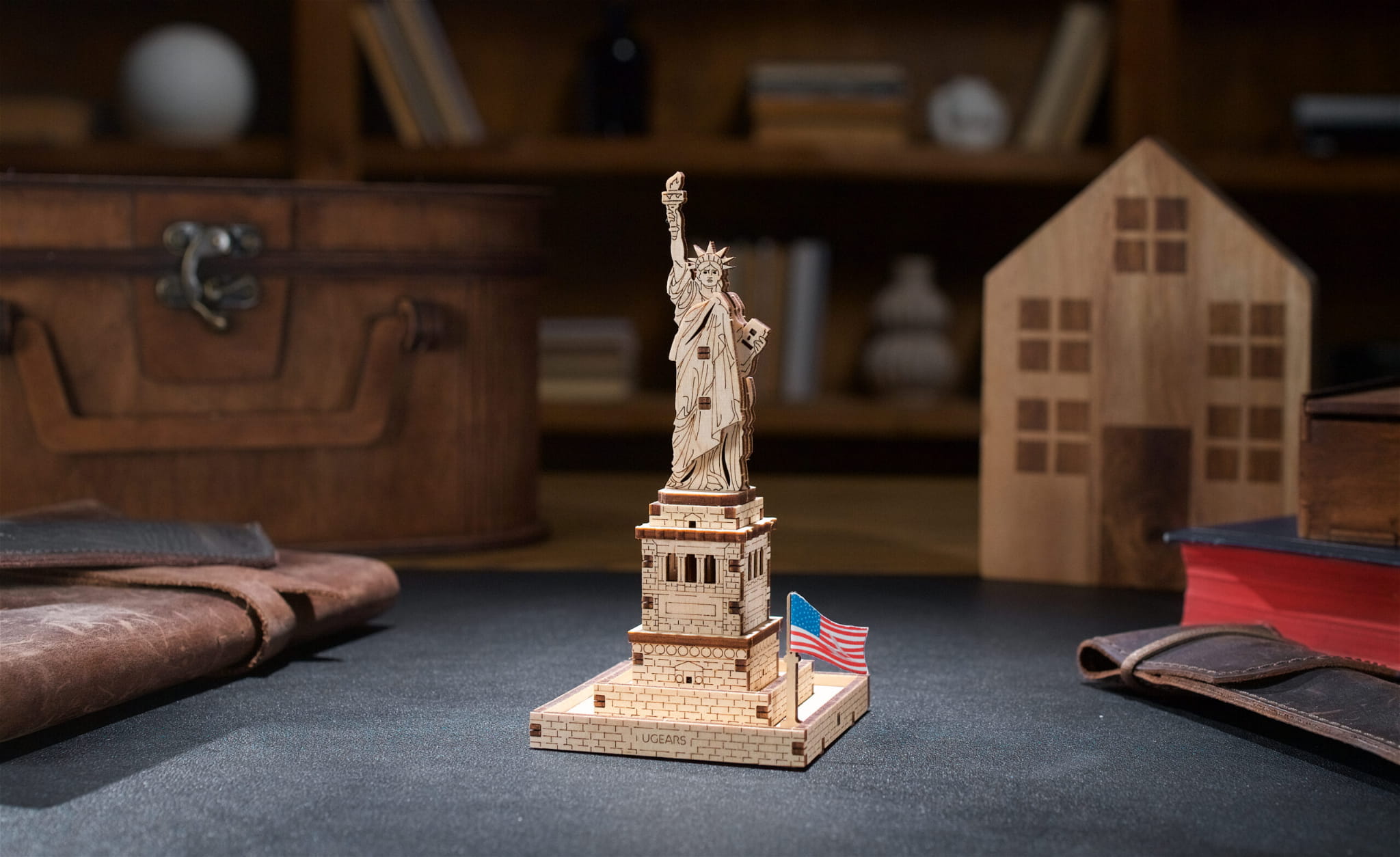 Model Statuy Wolności firmy Ugears z kolekcji World Cities to drewniany model ikony w skali 1:575, który ma 145 mm wysokości. Składająca się z 46 elementów wykonanych z drewna kompozytowego o jakości artystycznej, Statua Wolności jest oceniana jako “łatwa” i można ją zbudować w około 25 minut. Do zbudowania modelu nie potrzeba kleju ani specjalnych narzędzi, wystarczy wycisnąć elementy z laserowo wyciętych deseczek i połączyć ze sobą. Budowę ułatwiają ilustrowane instrukcje w 11 językach (angielskim, niemieckim, ukraińskim, francuskim, polskim, hiszpańskim, portugalskim, japońskim, włoskim, chińskim i koreańskim). Ten statyczny model 3D jest idealny do wyeksponowania na półce lub stole w domu lub biurze.